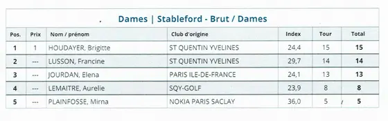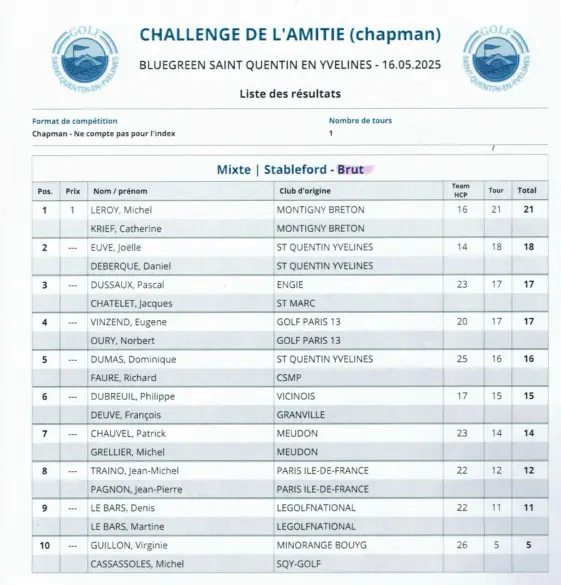 Résultats de la compétition tour N°4 golf de St Quentin en Yvelines