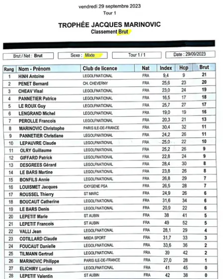 La compétition Jacques Marinovic s'est déroulée le vendredi 29 et le Samedi 30 septembre au Golf National , elle a été suivie par notre assemblée générale au cours de laquelle nous avons élu les membres du bureau, pour se terminer par notre traditionnel repas de fin d'année.